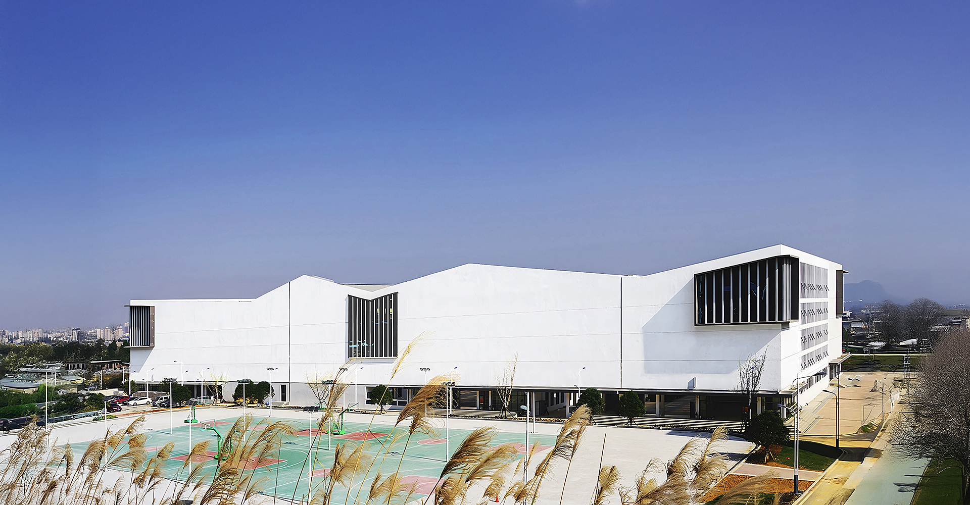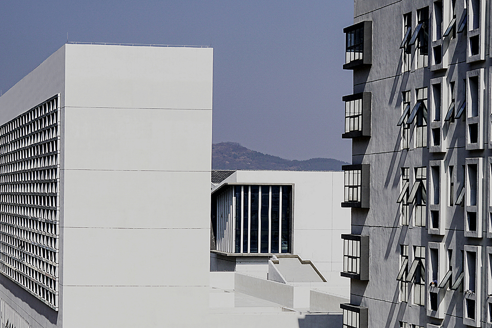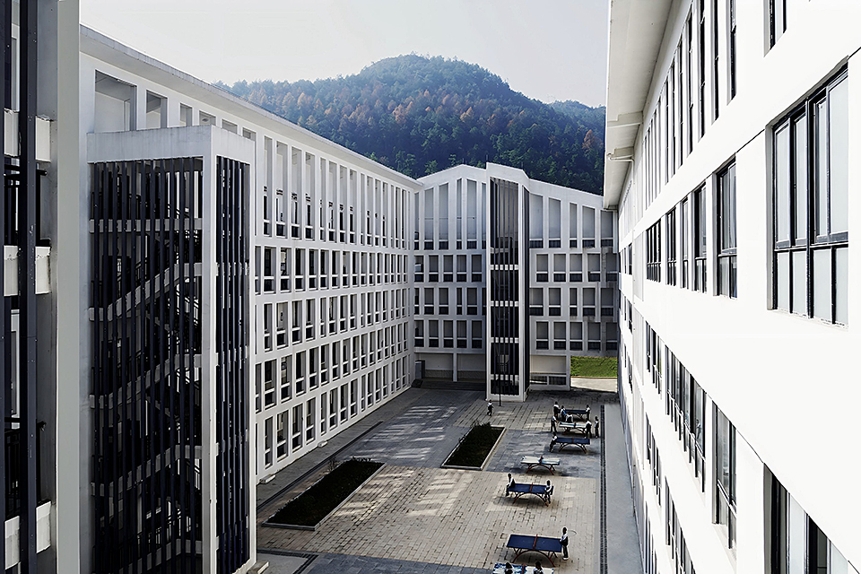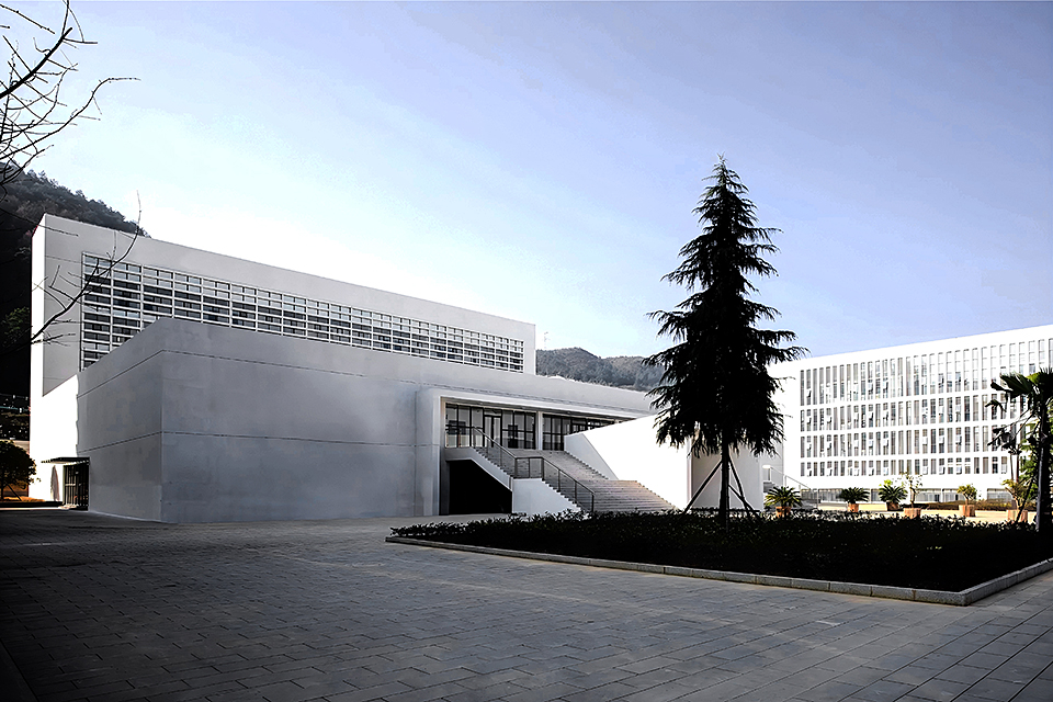 Dushan School Complex is situated on a north–south oriented rectangular site. To the north, the site is bordered by rolling hills and scattered residential buildings; the west is adjacent to a highway, and the east and south are flanked by urban roads. The architects envisioned the school as a campus composed of courtyard units inspired by traditional academies, using the arrangement of courtyards to create bright, dynamic, and quiet learning spaces that honor local scholarly culture while meeting contemporary educational needs.