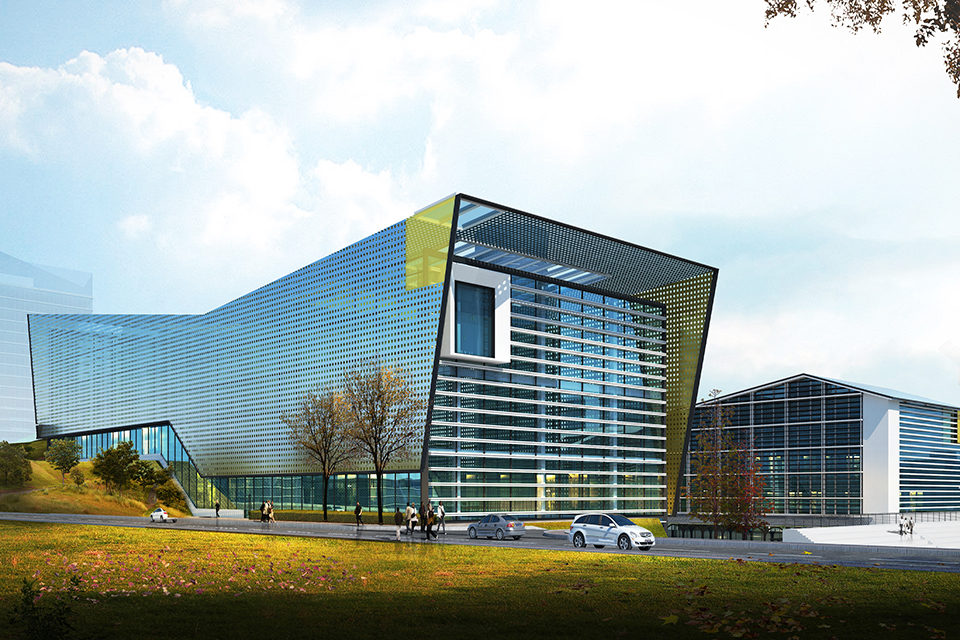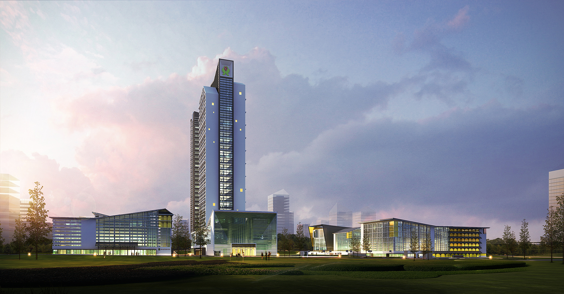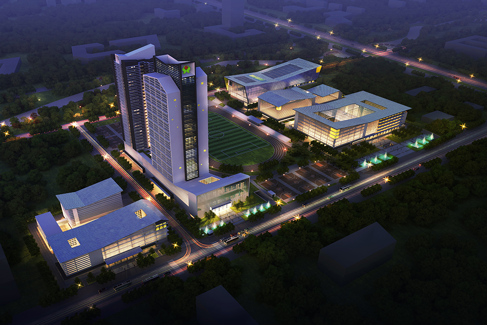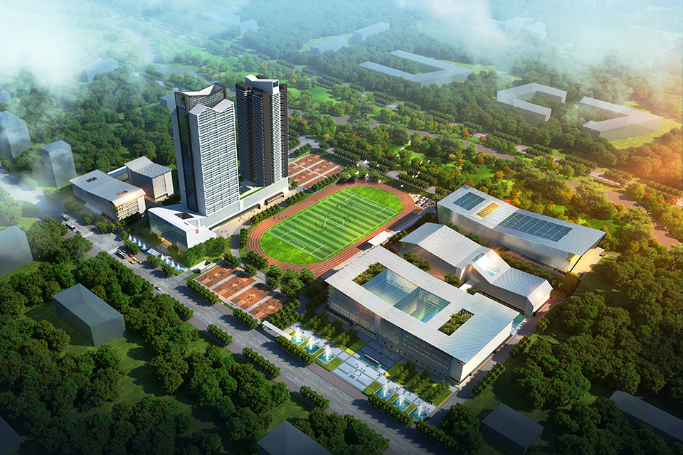 This project aims to construct a functional, intensive, and rhythmic multi-functional campus using a modern design language. The campus morphology is derived from a "circumferential dynamic layout" centered around a central football pitch. Towering functional blocks and staggered low-rise teaching clusters are arranged in a perimeter configuration, establishing a core-driven spatial organization system. This geometric logic achieves an organic separation of academic, athletic, and living zones, allowing high-efficiency educational environments to interweave and permeate with the open center of vitality. Regarding the façade expression, a modern translation of continuous arches combined with horizontal sun-shading louvers endows the buildings with profound cultural heritage and a strong sense of linearity. Through the interplay of light and shadow (solid walls versus glass curtain walls) and the integration of vibrant color accents, the proposal creates a contemporary campus space that is both highly recognizable and optimized for natural lighting and spatial hierarchy.