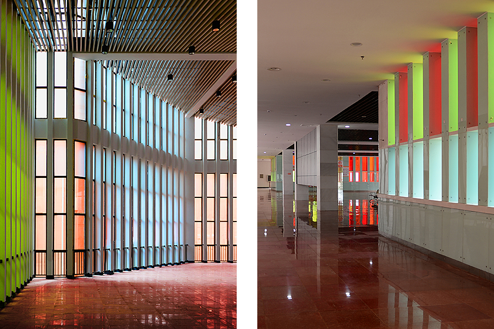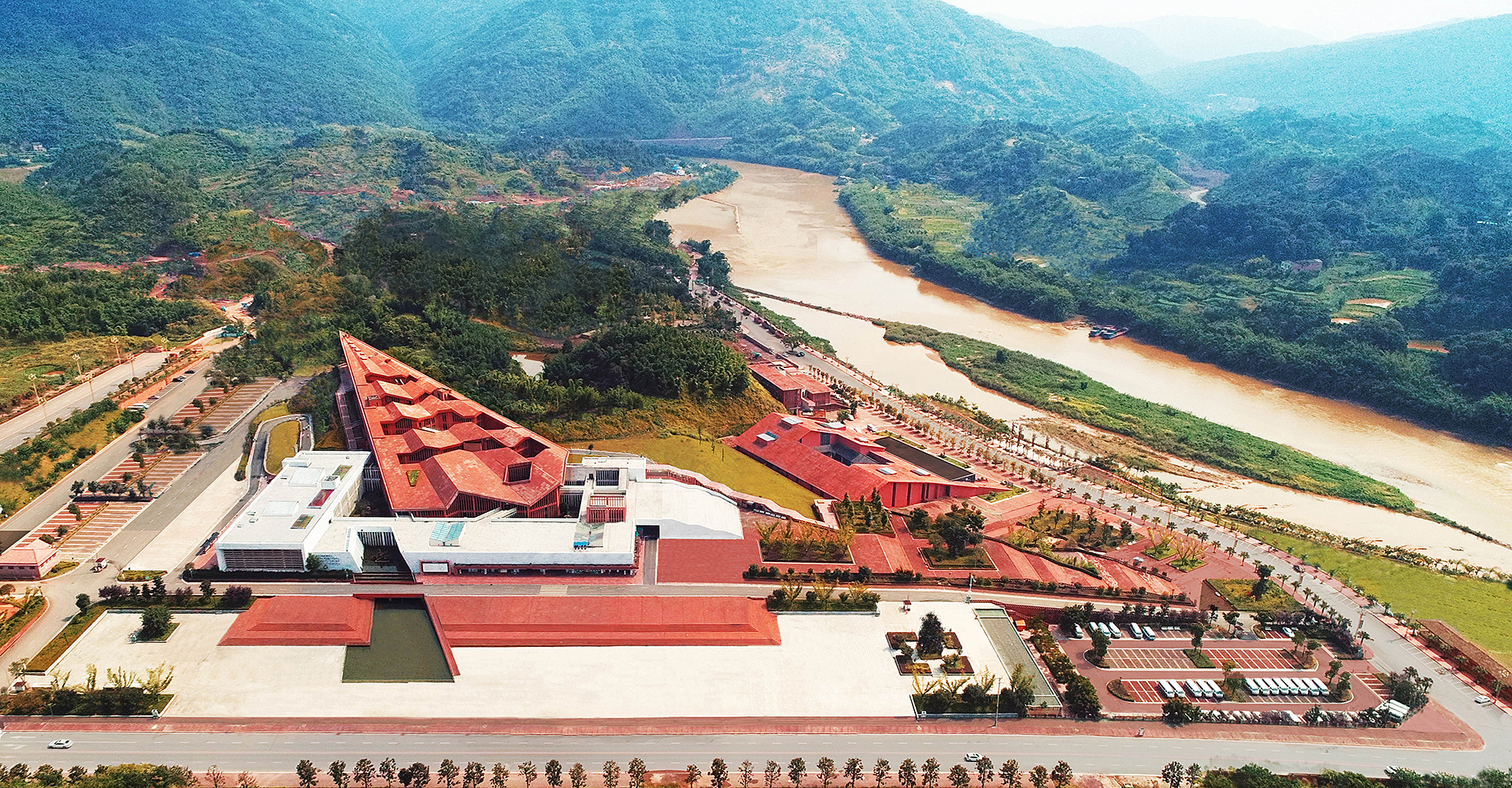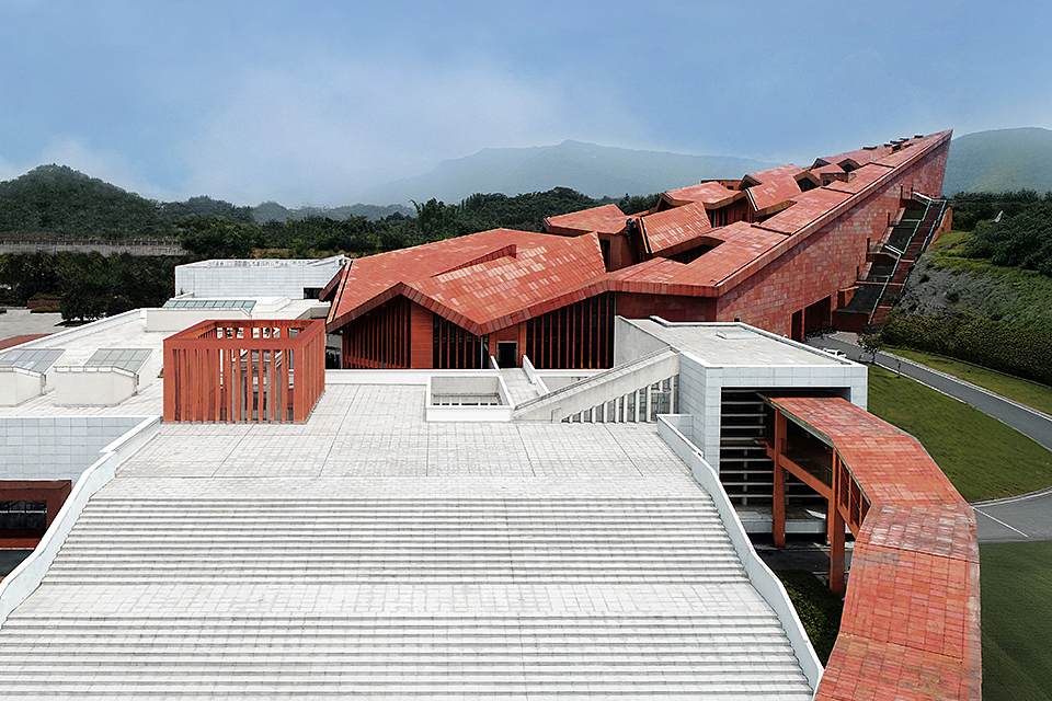 The building is composed of two hierarchical sets of isomorphic units. The first level consists of five red, sawtooth-shaped conical volumes leaning against the mountain, housing office spaces with a visitor center above. The second level is made up of white plinth-like units, connected through courtyards to form a “U”-shaped structure serving the public reception functions of the tourist center. The interlocking configuration of these two layers clearly reflects the influence of local vernacular architecture, characterized by undulating rooflines and stacked foundations.