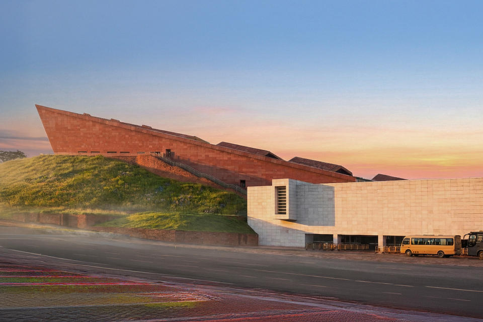 Chishui Danxia World Natural Heritage Visitor Center is situated on a sloping terrain surrounded by red Danxia stone peaks, nestled between mountains and water. The site unfolds as a series of ascending parallel terraces with a distinct central ridge, and a flat, open area at the base. The architecture features striking red conical volumes standing atop a white plinth, aligned with the slanted axis of the mountain ridge, creating a strong spatial relationship with the horizon and reflecting the unique topography.