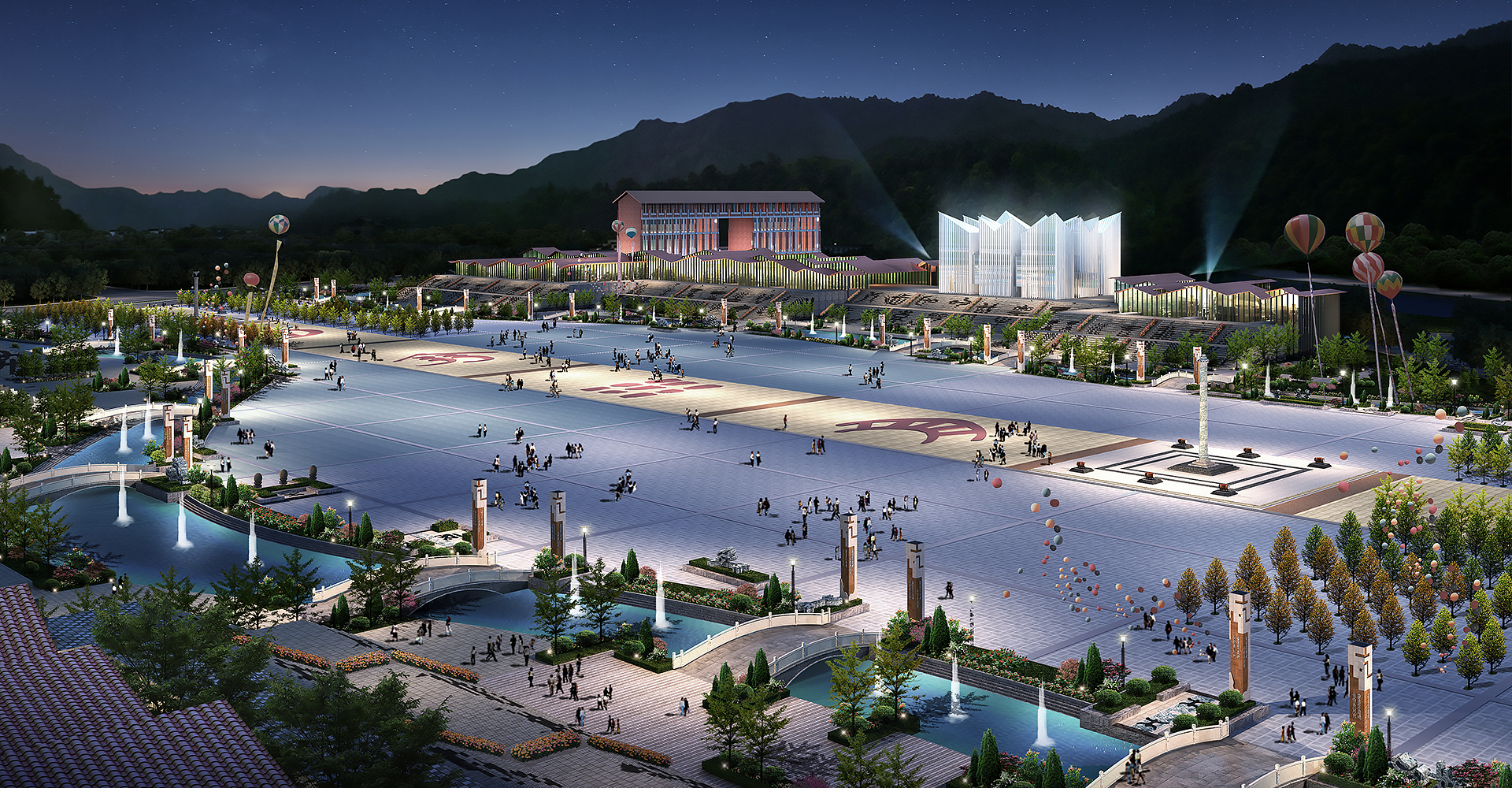 The square features regional commercial facilities, a large exhibition center, an open space for ethnic celebrations, underground commercial areas, and parking spaces, all integrated with water features and green landscapes. The core area is designed as a grand gathering plaza, emphasizing a central axis that serves as a comprehensive urban axis, incorporating urban space, green spaces, ethnic culture, regional services, and commercial landscapes.