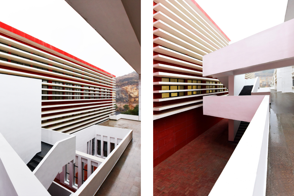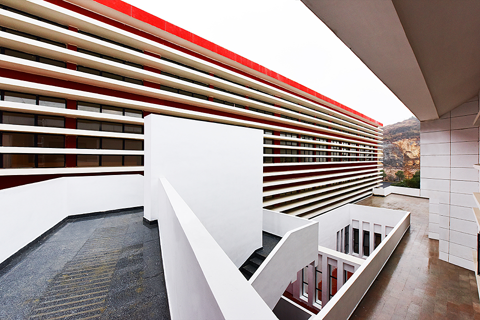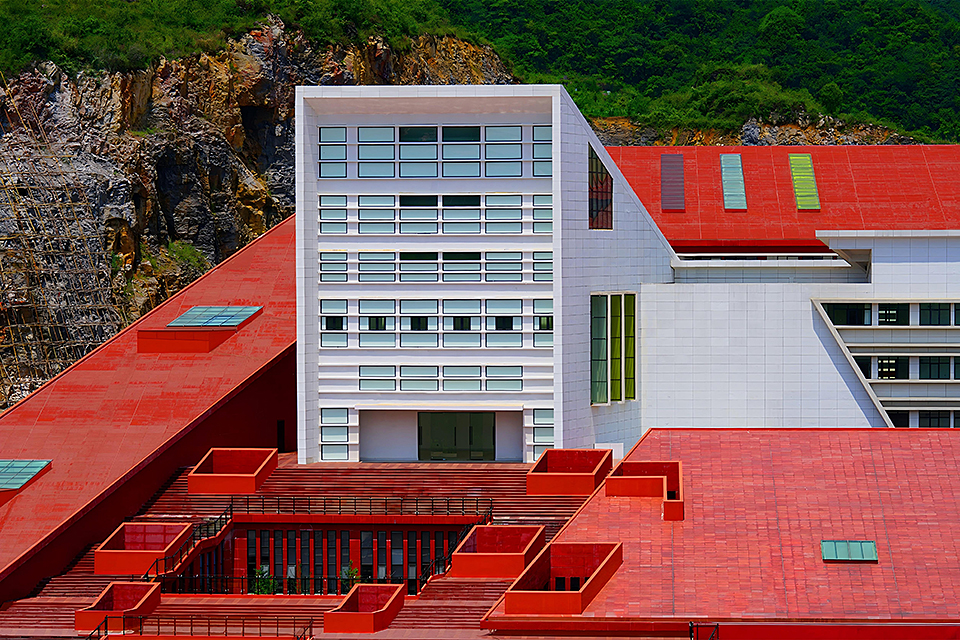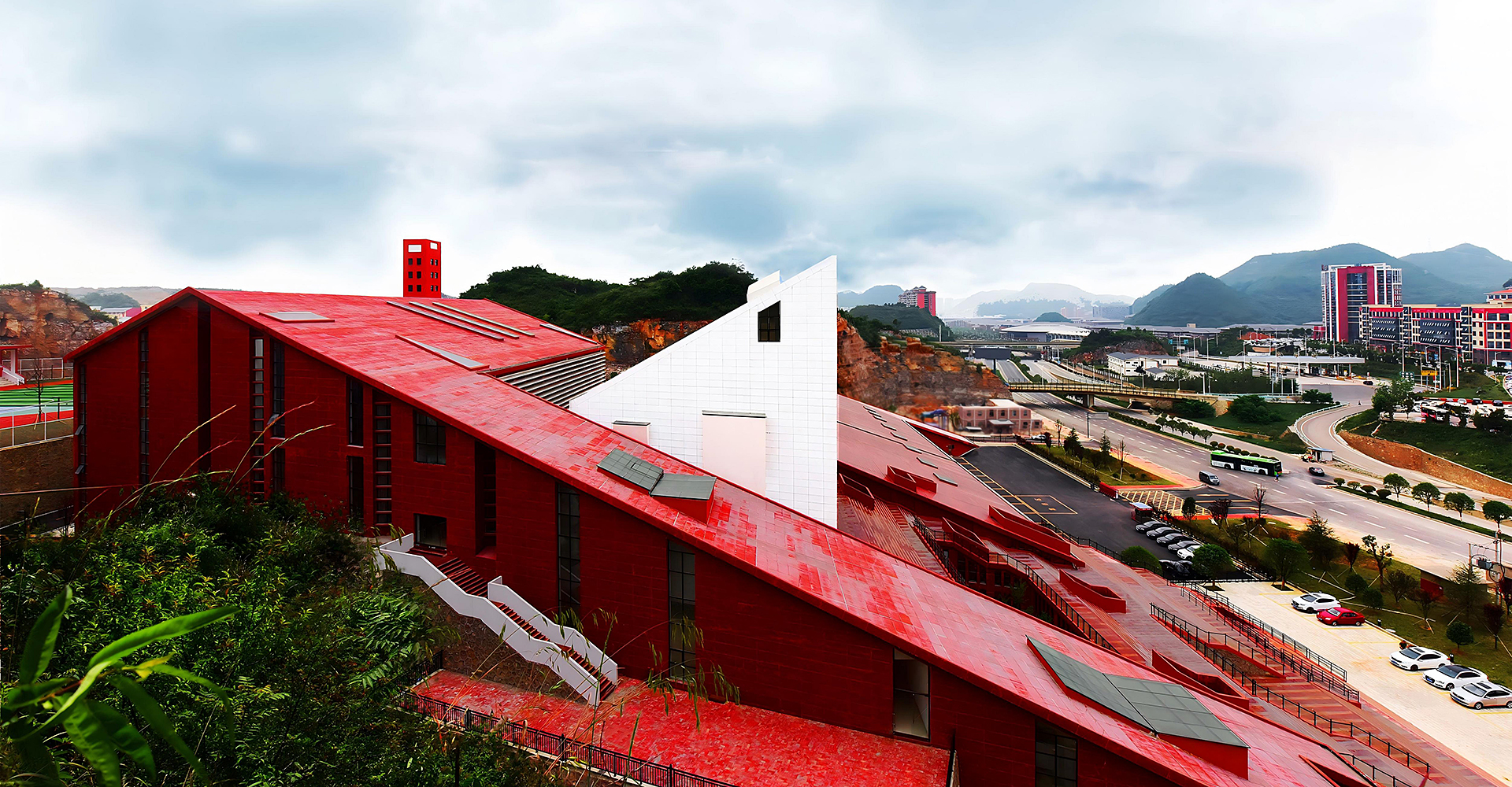 This project primarily serves the local needs for firefighting and emergency response, functioning as a vital urban public infrastructure. The design makes full use of the mountainous terrain, adapting to the site conditions and leveraging the natural landscape to create a grand and solemn architectural image. The overall layout adopts parallel L-shaped volumes to organize the mountainous space, effectively avoiding the disorder often caused by complex elevation differences and establishing a unified, orderly, and coherent spatial structure. The architectural form is inspired by the basic composition of peak cluster landforms—“mountain peak + base.” A large red sloped surface is inserted between two peaks, completing the landform composition while symbolizing the power and speed of firefighting and rescue missions. External architectural elements are kept minimal, with only a training tower and a white ceremonial hall breaking through the red slope at the northern corner. The hall is designed as a spiritually symbolic space of solemnity. The design follows the generative logic of local village settlements, adopting a hierarchical, isomorphic approach based on the pattern of “unit → group → cluster.” A series of terraced units enclose the white ceremonial hall, establishing a spatial order with a sense of progressive ritual. The white functional volumes form a striking contrast with the red architectural mass, enhancing both visibility and symbolic meaning. The overall form reflects the contours of the surrounding mountain landscape, expressing a harmonious integration of functionality and spiritual resonance.
