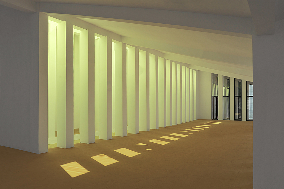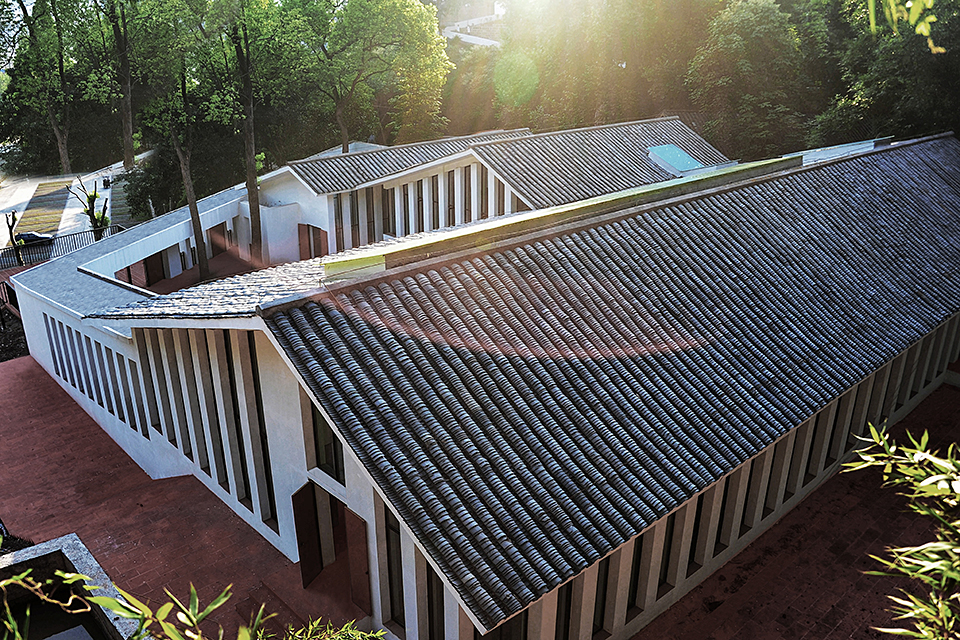 Drawing inspiration from local traditional dwellings, the design transforms gray-tiled sloping roofs into a flowing, undulating roofscape. The multi-courtyard layout is well-suited to the region’s humid climate, creating a solemn yet vibrant atmosphere through thoughtful spatial composition. The courtyards preserve two 50-year-old camphor trees, while a central white terrace and a warmly lit atrium enhance the ceremonial ambiance. A narrow northern light court, enclosed by frosted skylights and white colonnades, evokes a pure and sacred atmosphere, while a triangular courtyard in the northwest corner, adorned with an osmanthus tree, adds a refreshing touch.