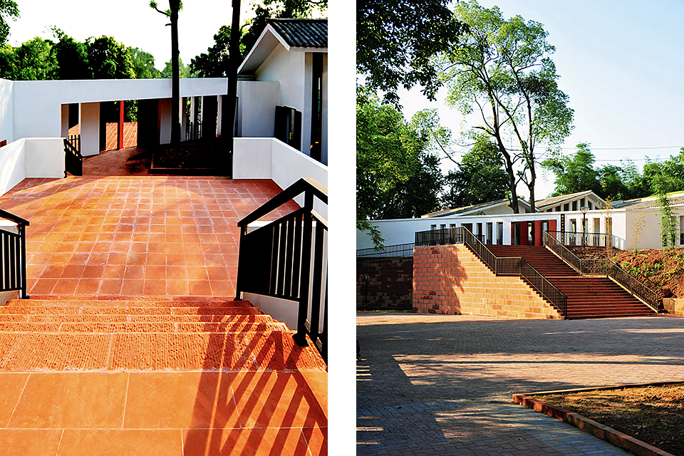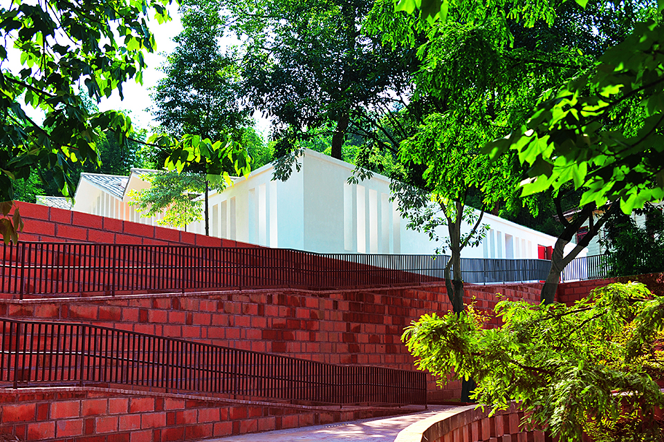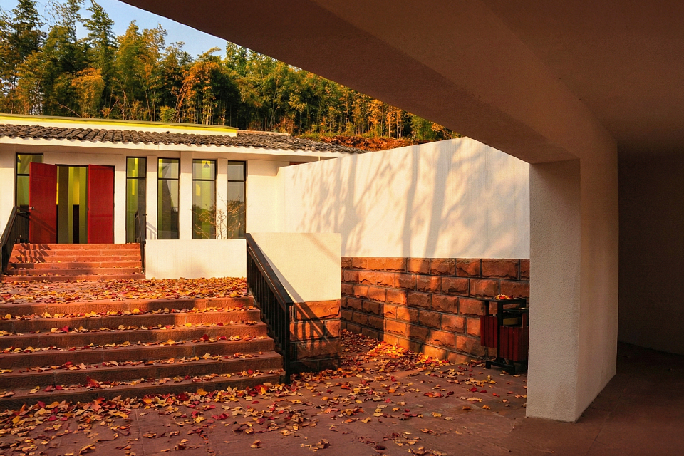 The building is integrated into the Danxia stone hillside, surrounded by traditional gray-tiled houses, with a site elevation difference of over ten meters. Adapting to the terrain, the exhibition hall features a three-tiered terraced courtyard and a circular ramp layout, while preserving old trees and bamboo groves to blend seamlessly with the natural environment. The angled southern design echoes the Danxia stone steps at the cemetery’s main entrance and connects to the northwest vehicle path via an accessible ramp, forming a trapezoidal courtyard arrangement.