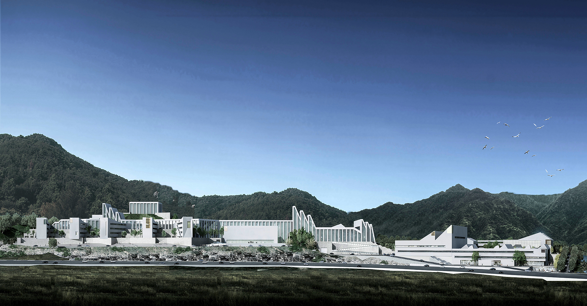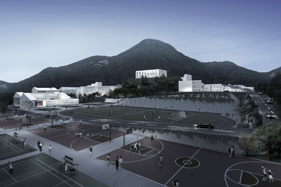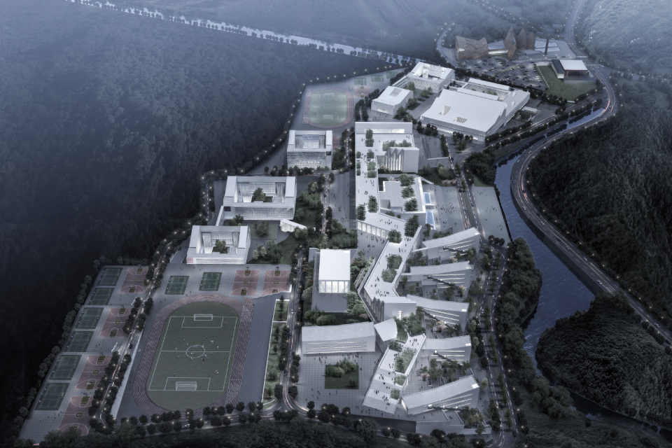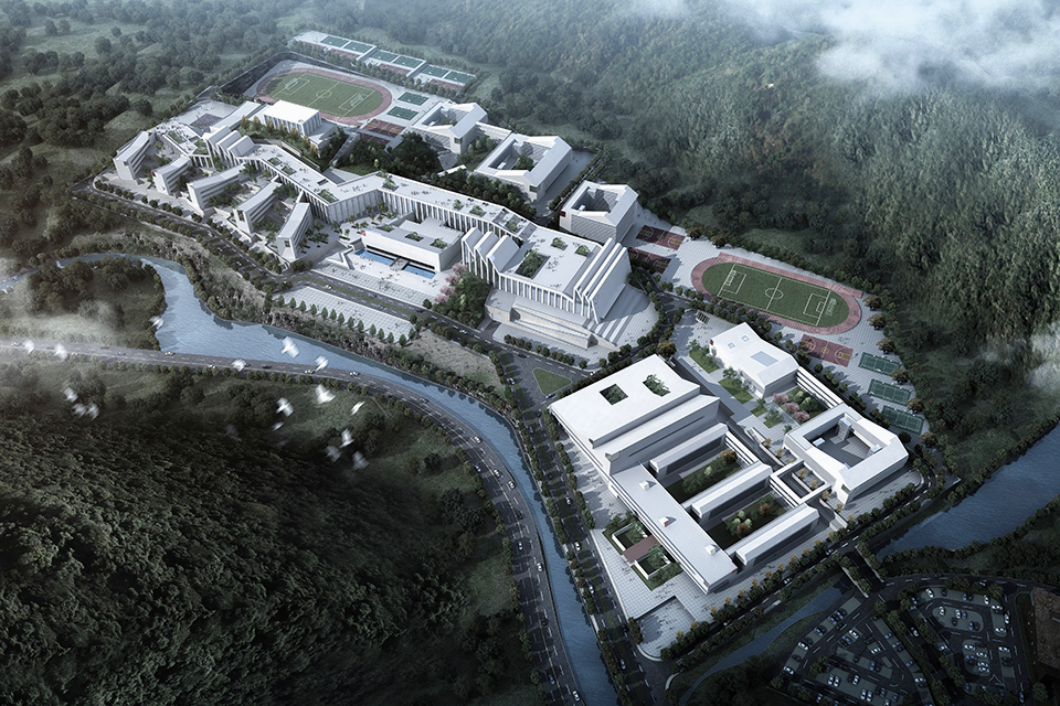 The design fully considers the terrain elevation differences, strategically arranging sports fields and teaching buildings to minimize earthwork. Through diverse design approaches, it showcases the diversity, openness, and inclusiveness of campus culture while integrating natural elements to protect and establish an ecological system, creating a green and sustainable campus. This project follows a “Two Major Sections + Four Functional Zones + Three Landscape Systems” model, comprising a middle school section and a primary school section. The four zones include the middle school teaching area, middle school residential area, primary school teaching area, and primary school residential area, while the landscape system incorporates riverfront, valley, and academy-style landscapes. The overall planning adopts a vertical tree-like structure, horizontal multi-layered spatial control, courtyard spatial management, and a multi-scale courtyard landscape system. The northern section houses the middle school, with an administrative and teaching corridor along the ridge and a rooftop activity area to enrich public life. An outdoor sports field is placed in a sunken area, and a gymnasium is set at the hilltop as a visual focal point. The southern section features an academy-style primary school. At the intersection of the primary and middle school, a cultural complex—including a library, science center, auditorium, and art museum—serves both sections. All functional areas are interconnected by covered corridors, ensuring a seamless and comfortable educational environment.