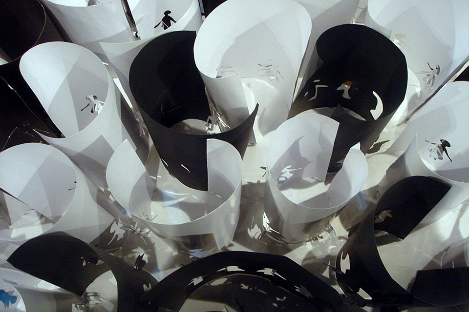 On the spatial level, the design materializes into two types of environments: fluid spaces and retentive spaces. The former possesses qualities of diffusion and penetration, while the latter introduces resistance, naturally generating a tension between motion and stillness. Through the action of “rolling,” the spaces form enclosed or semi-enclosed states, implying centripetal and exclusive aspects of social organization. The whole is constructed from around 300 A3-sized fragments, in a black-to-white ratio of roughly 4:6. Arranged in proximity, in linear sequences, in clusters, or as isolated units, these fragments produce diverse boundary configurations that articulate the complex interactions between systems and social structures.