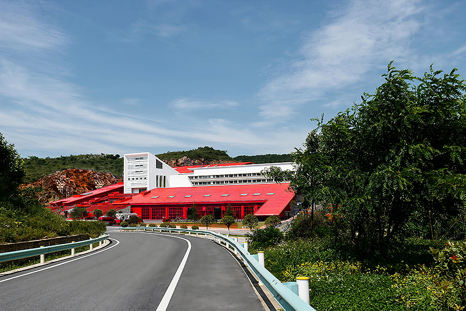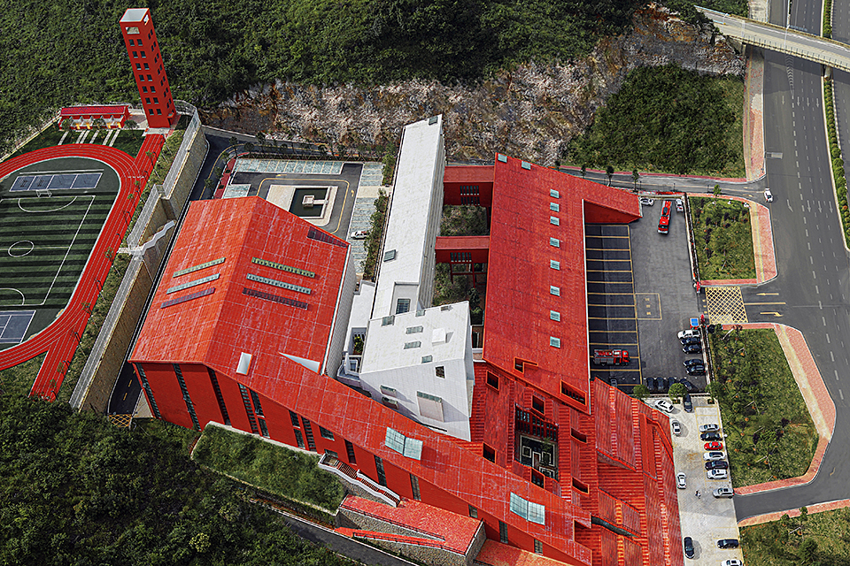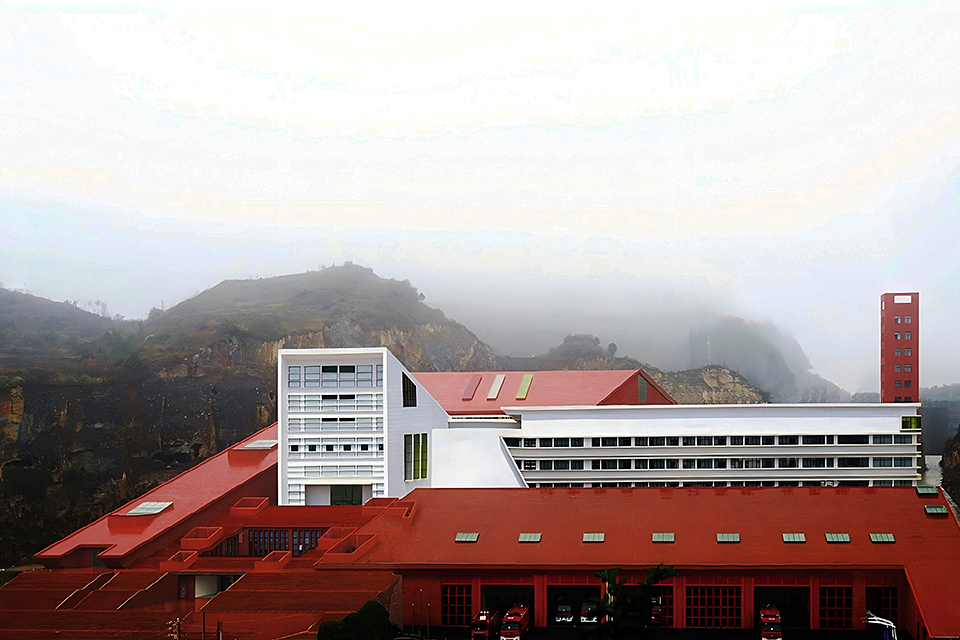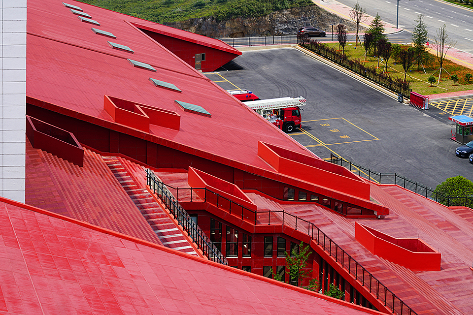 This project primarily serves the local needs for firefighting and emergency response, functioning as a vital urban public infrastructure. The design makes full use of the mountainous terrain, adapting to the site conditions and leveraging the natural landscape to create a grand and solemn architectural image. The overall layout adopts parallel L-shaped volumes to organize the mountainous space, effectively avoiding the disorder often caused by complex elevation differences and establishing a unified, orderly, and coherent spatial structure. The architectural form is inspired by the basic composition of peak cluster landforms—“mountain peak + base.” A large red sloped surface is inserted between two peaks, completing the landform composition while symbolizing the power and speed of firefighting and rescue missions. External architectural elements are kept minimal, with only a training tower and a white ceremonial hall breaking through the red slope at the northern corner. The hall is designed as a spiritually symbolic space of solemnity. The design follows the generative logic of local village settlements, adopting a hierarchical, isomorphic approach based on the pattern of “unit → group → cluster.” A series of terraced units enclose the white ceremonial hall, establishing a spatial order with a sense of progressive ritual. The white functional volumes form a striking contrast with the red architectural mass, enhancing both visibility and symbolic meaning. The overall form reflects the contours of the surrounding mountain landscape, expressing a harmonious integration of functionality and spiritual resonance.