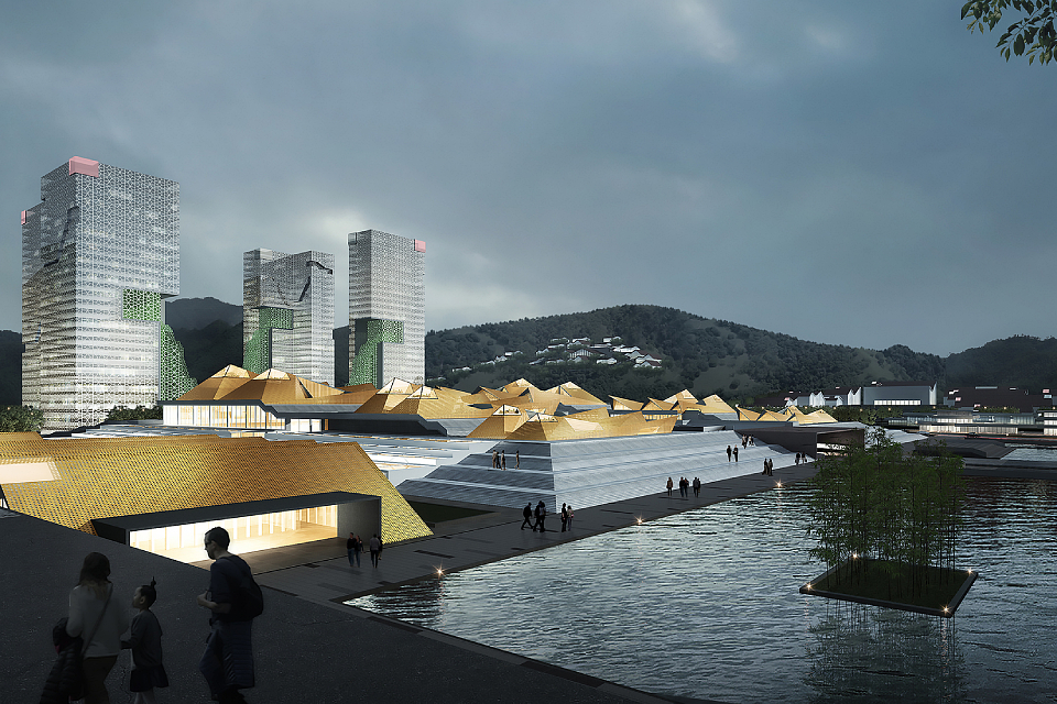 In terms of architectural form, the scheme reinterprets traditional elements of Chinese architecture—such as the Xumizuo podium—through a contemporary lens to construct a highly legible and powerful base system. The podium defines clear spatial boundaries, strengthens the anchoring relationship between architecture and the ground, and establishes a distinct hierarchy between “upper” and “lower” spaces. This organization generates ceremonial public and exhibition spaces of a grand and dignified character, endowing the overall setting with a sense of stability and symbolic presence.